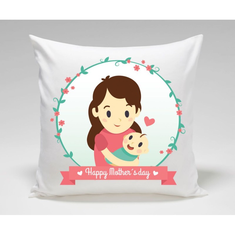 Beautiful Mothers Day cushion inscribed with Happy Mothers Day and a mother holding her cute baby in her arms.