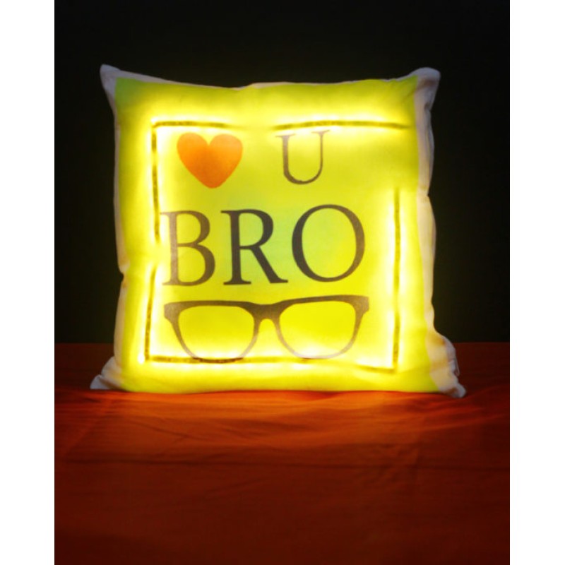 This cushion in particular has the message "Love You BRO" mentioned on it which glows when you switch on the inbuilt LED of the cushion.