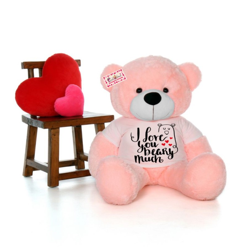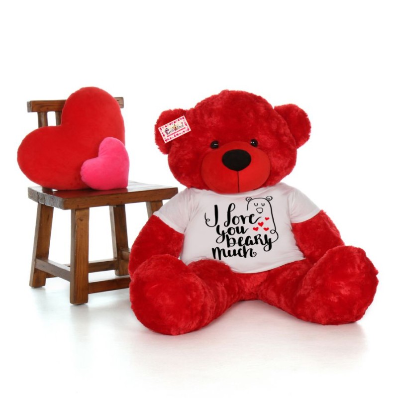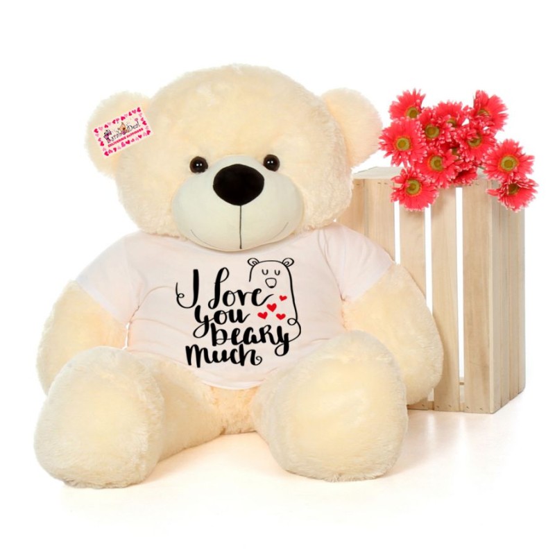 Our Giant 5 feet personalized teddy bear wearing I Love You Beary Much tshirt is available in Red, White, Peach, Brown, Pink, Purple and Blue. Choose your favorite fur and we will send out the same to your loved ones.