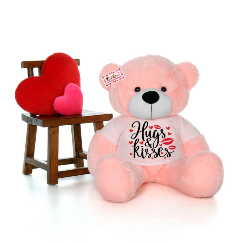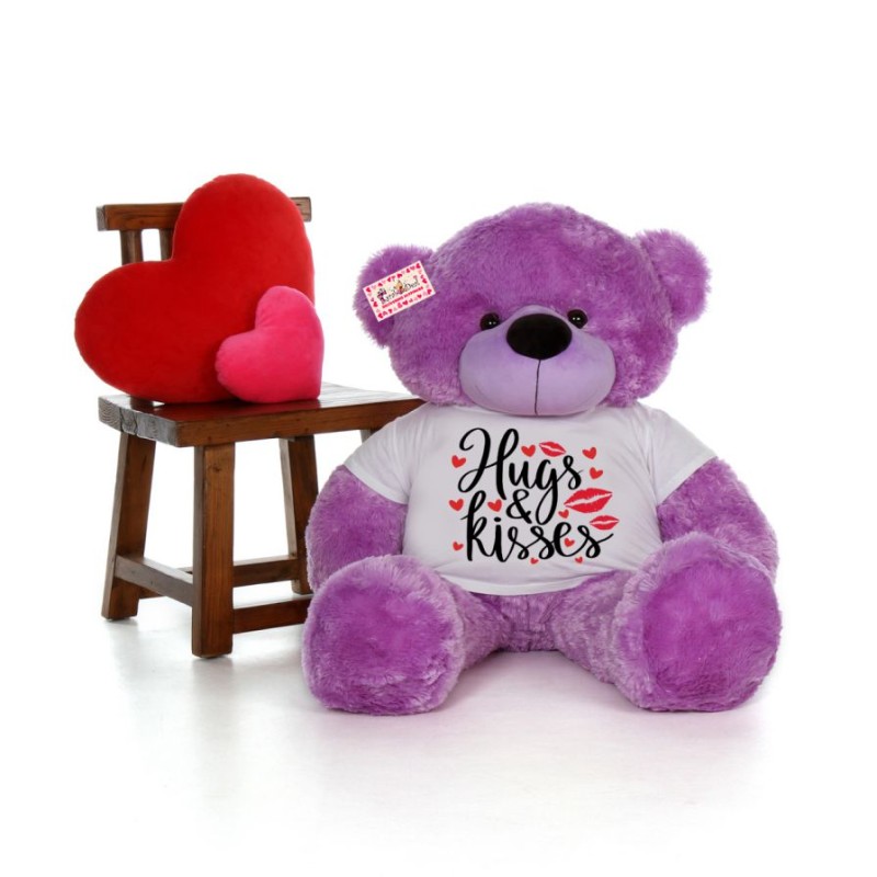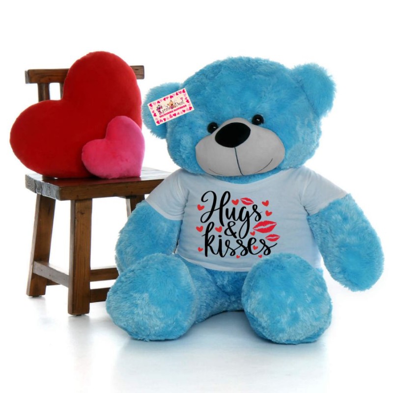 Our Giant 5 feet personalized teddy bear wearing Hugs And Kisses tshirt is available in Red, White, Peach, Brown, Pink, Purple and Blue. Choose your favorite fur and we will send out the same to your loved ones.