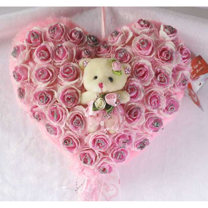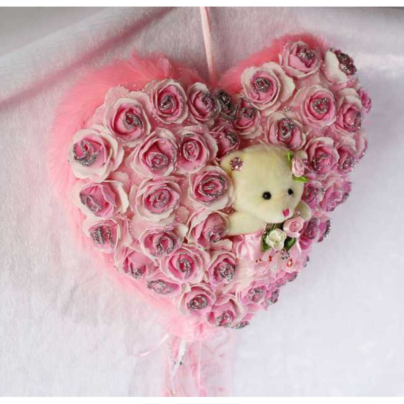 If you are looking for a special gift for someone then nothing can be a better option than this hanging heart with baby doll teddy bear. Soft toys are loved by the people of all age groups. This hanging heart is pink in color and is covered with beautiful pink imported roses. The heart is decorated with ribbons and a cute baby doll teddy bear is situated in the middle. You can decorate your home with this adorable hanging basket or can gift to your near and dear ones. Specially handcrafted in INDIA.