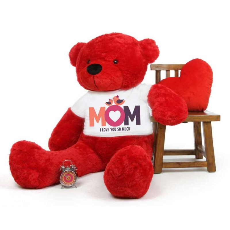 Red 5 feet Big Teddy Bear wearing a Mom I Love You So Much T-shirt