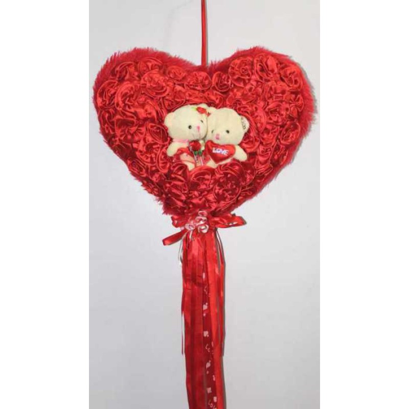 If you are looking for a special gift for someone then nothing can be a better option than this hanging heart with couple teddy bear. Soft toys are loved by the people of all age groups. This hanging heart is red in color and is covered with beautiful red satan roses. The heart is decorated with ribbons and a cute teddy bear couple is situated in the middle. You can decorate your home with this adorable hanging basket or can gift to your near and dear ones. Specially handcrafted in INDIA.