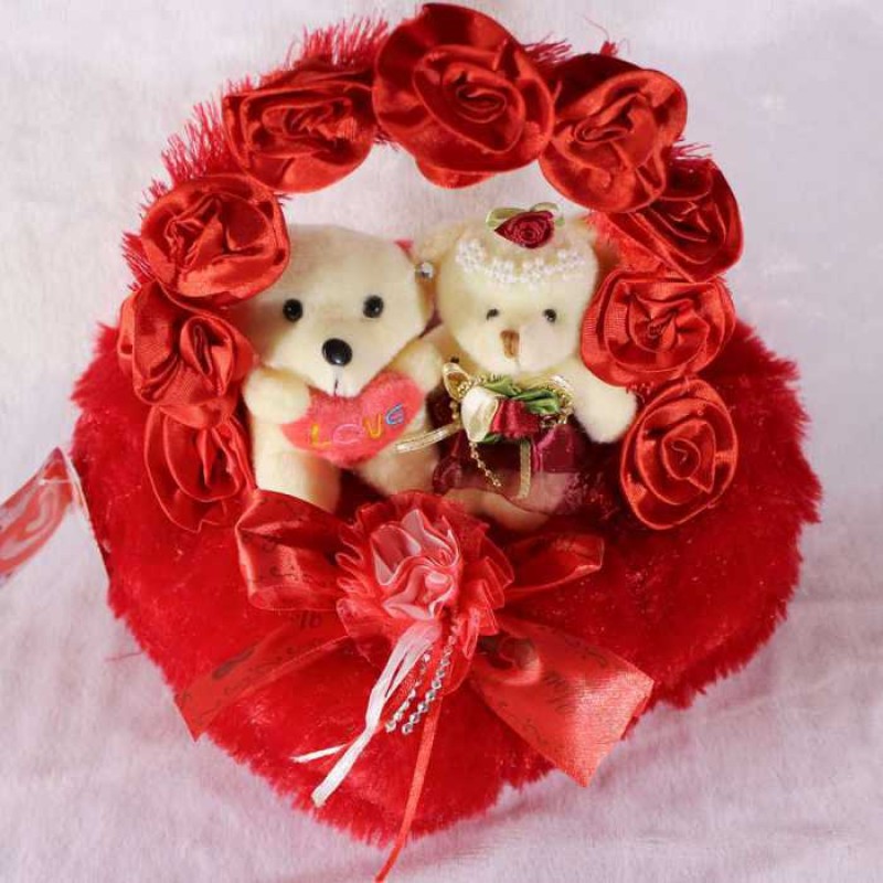 With a lovely couple showpiece, you can win your beloveds heart easily. Make him or her elated from the core, this Valentines Day with a gift that will not only make him or her smile for every day. The showpiece we have here, is made to sit beautifully and it is made in red. It is a red heart cushion and a satin rose handle attached to it for easy carry. There are two teddies seated on it. Both male and female teddy signifies a couple truly in love. Present it to her and make her heart melt with love. Specially handcrafted in INDIA.