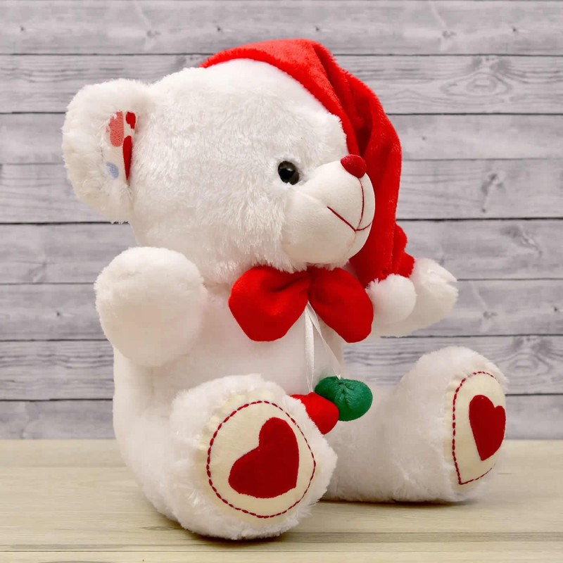 White 15 Inch Christmas Bow Teddy Bear with Santa Cap